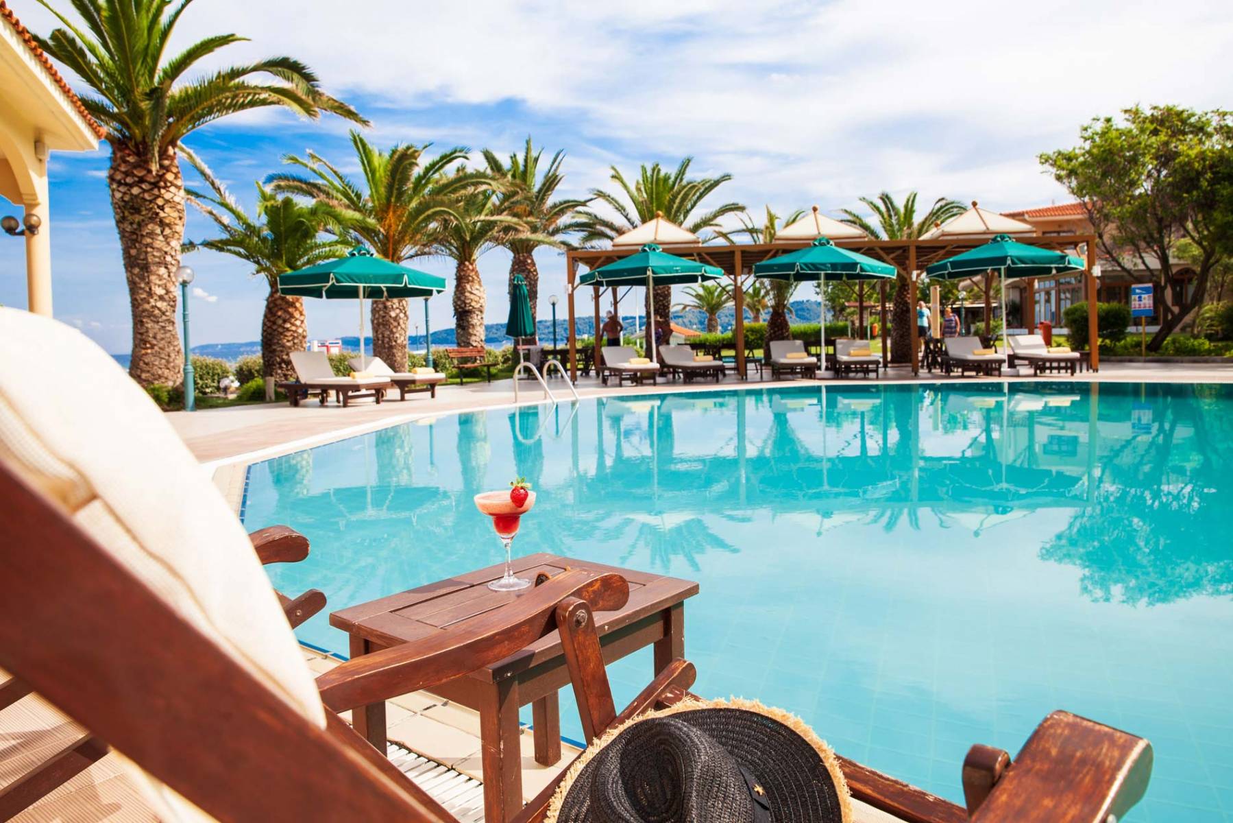 A large outdoor fresh water pool for adults and adjacent to it, a smaller one for children, are located near the central building of the hotel complex. The pools are well attended and cleaned with state of the art equipment, in order for the water to be crystal clean. Enjoy safe swimming and sunbathe in the hot Greek sun on comfortable wooden deck chairs and sun loungers. The sea breeze and the nearby pine trees lend a sense of coolness even if you are in the midst of summer. There are, of course, several large umbrellas available for all those who would rather avoid direct exposure to the sun.